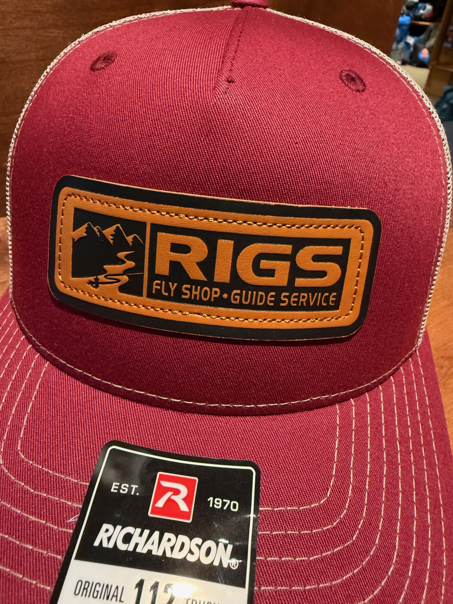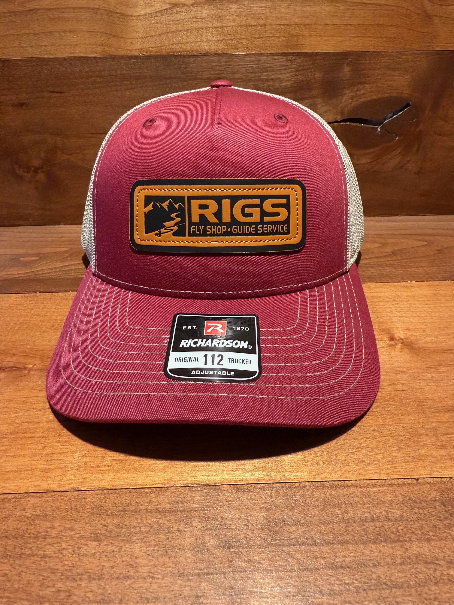 RIGS Debossed Leather Hat 112FP in Cardinal/Tan features a structured fit, breathable mesh, and a premium leather patch. Bold colors and durable everyday comfort for anglers and fans of RIGS Fly Shop.